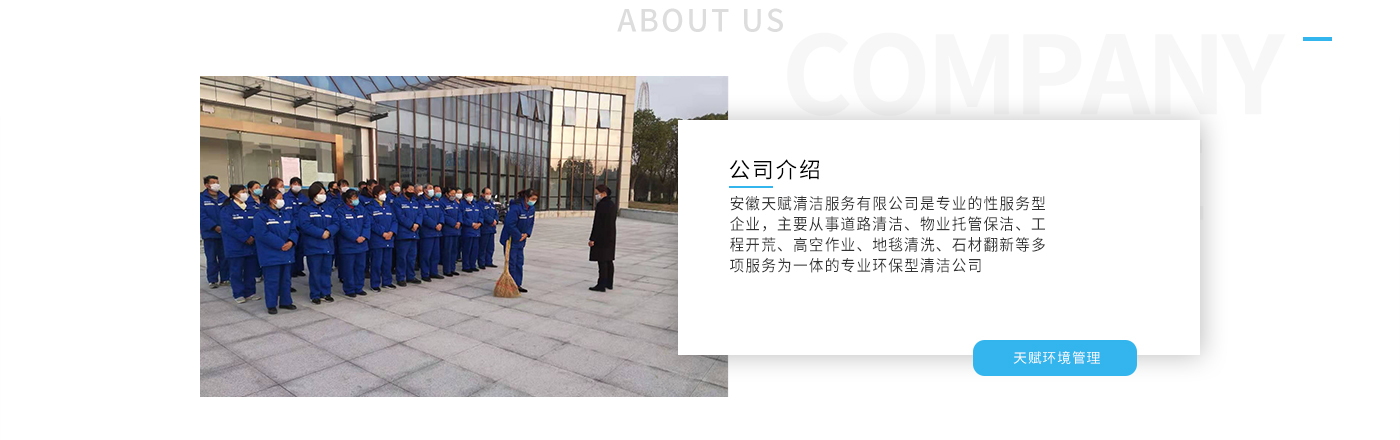 安徽天賦清潔服務有限公司是的服務型企業,主要從事道路清潔、物業托管保潔、工程開荒、高空作業、地毯清洗、石材翻新等多項服務為一體的環保型清潔公司。公司管理機制完善,清潔作業經驗豐富,擁有技術力量,嚴格實行崗前培訓—崗中督查—上崗在培訓的員工管理措施,憑著優良的清潔質量和嚴格的督查管理,為眾多企事業單位、醫院、酒店、廠區商場、物業、道路、學校、公園等提供后勤清潔服務。在業內擁有良好的口碑。工作人員,服務態度優,竭力為客戶提供好的保潔服務。安徽天賦清潔服務有限公司:致力于長期合作關系,提高服務質量,提供高標準的清潔服務。公司的經營理念:為營造一個更清潔、亮麗的生活和工作環境而努力!“誠信”是公司成功保證。“客戶至上,信譽為首”是公司宗旨。高標準提供服務,維護客戶利益、形象,是我始終不渝的目標。